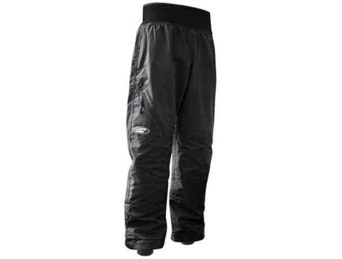 Mooner Pants: Drypants; waterproof/breathable base fabric provides the kind of additional warmth and protection you've come to enjoy from your drypant. Mooners2 are especially designed to mate up with any drytop that has a sprayskirt tunnel for cold paddling days. Wide neoprene waistband is reversed with a grippy outer surface to seal and mate against your drytop skirt tunnel and (and skirt tube) to reduce slippage even in the most turbulent conditions. Inside, bunji drawcord allows additional tension adjusting as desired. Below the waist, the fit is roomy with flexibility for sitting, standing, kneeling. Knees and seat are doubled and reinforced with 500 denier cordura. Knees and shin padded with a slim barrier of PE foam. Latex rubber ankles cuff covers have adjustable neoprene cuffs and a booty-tunnel (like a skirt tunnel) that keeps you drier below the ankles. Completely waterproofed, taped seams throughout. Zippered aquatic rubber mesh thigh pocket.
