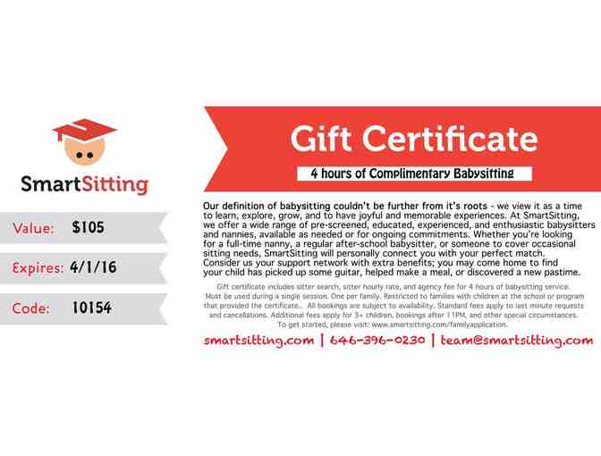 One per family - no exceptions. Restricted to families with students at the school/program where the auction is being held (Midtown West PS 212). Must be used during a single session. Additional hours compensated at $20/hr. Additional fees may apply to families with more than 3 children, late nights, and other special circumstances. New families should provide at least 2 days advance notice for bookings. We will do our best to fill every request but availability cannot be guaranteed. We currently serve Manhattan, Brooklyn, and parts of Queens. Certificate expires on 4/1/16.