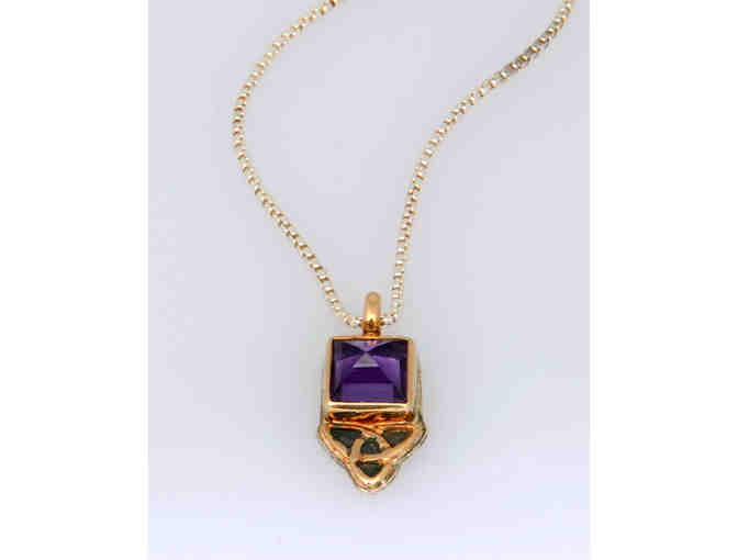 A square Amythest bezel set, atop a 14K gold plated trinity knot, and 16" sterling silver chain.
