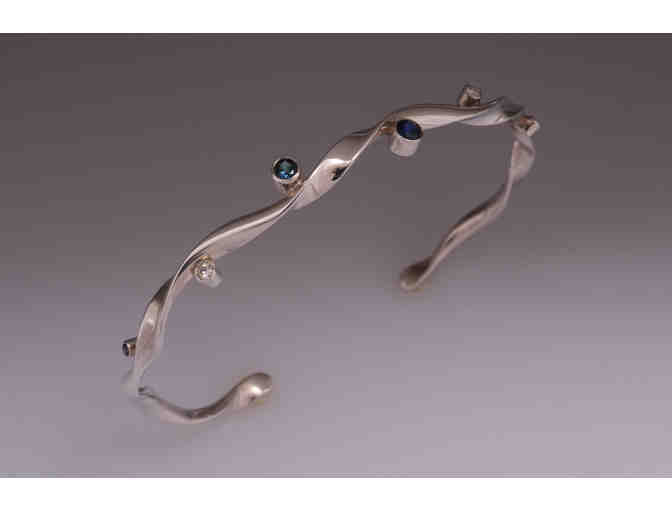 This signature Taber Studios bracelet in Recycled Silver, Fairtrade Sapphires, and Moissanite Diamonds is reminiscent of the sea. Comfort fit with flexiblity.