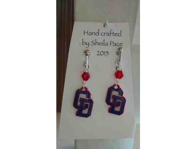 Hand made sterling silver clip-on earrings with CD logo pendant, and red and white glass Swarovski Crystals. Original made by Sheila Pace.
