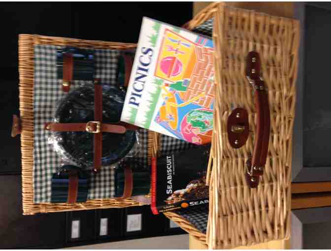 Beautiful picnic basket with all the essentials needed for a day outside, including good read, "Seabiscuit" and "Picnic" cookbook.