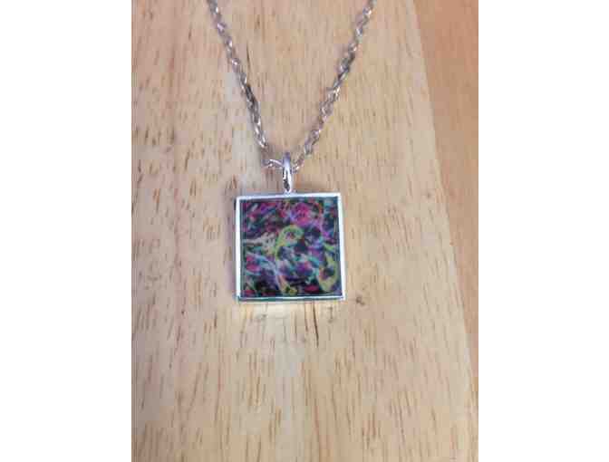 Dazzle your friends by wearing an audiology-themed necklace consisting of sterling silver, printed paper, and resin.