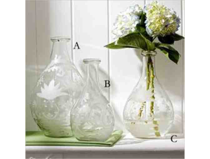 Beautiful glass etched vase by Two's Company. Shown in picture as #A.