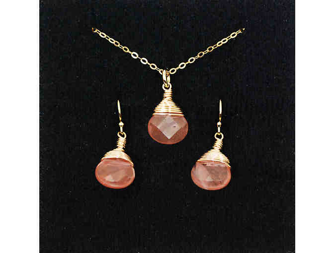 Beautiful, genuine faceted Cherry Quartz briolette drop, wire wrapped with gold-filled wire. This necklace and earrings set is absolutely lovely!