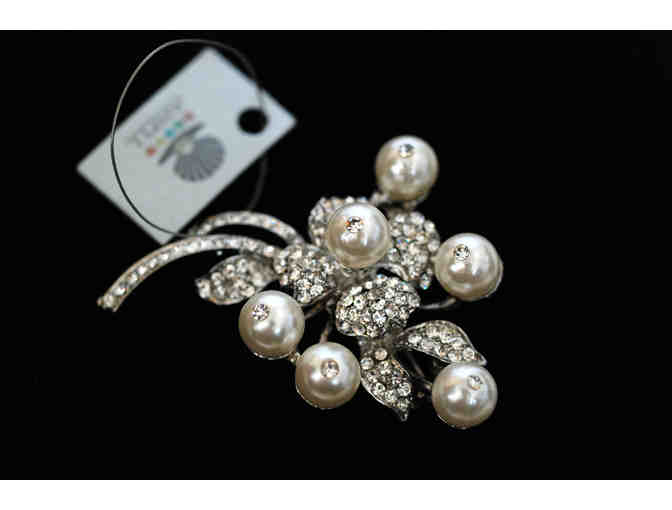 This lovely pearl and rhinestone brooch comes with a 24" silver chain so it can also be worn as a pendant.