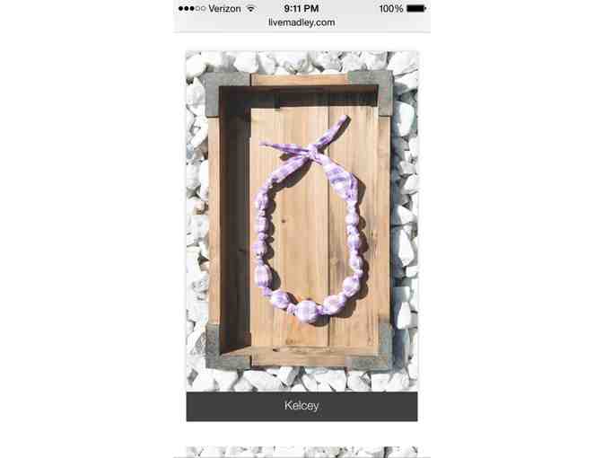 Fabric necklace with internal wooden beads. Adult size is approx. 36" long and Child size is approx. 30" long. Necklace uses a tie closure and can be worn at varying lengths. Please note actual lengths may vary.