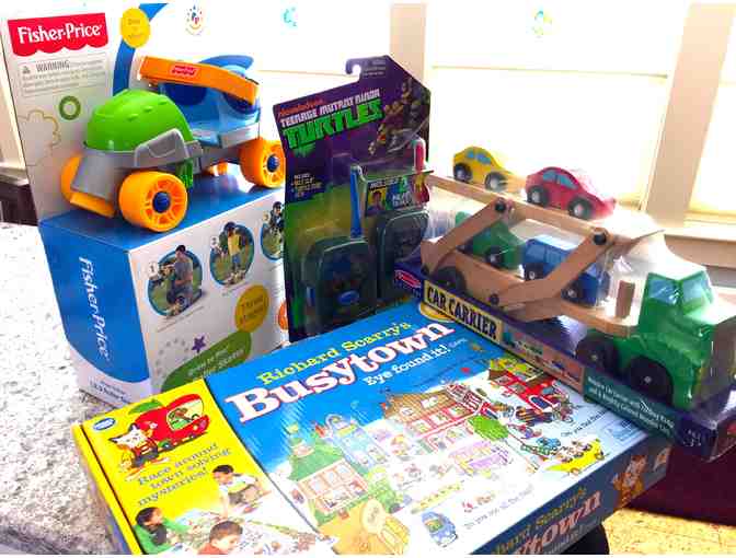 Melissa and Doug Classic Toy Car Carrier, Richard Scarry's Busytown I Found It Game, Nikelodeon Teenage Mutant Ninja Turtles 2 Walkies Talkies, and Fisher Price 1,2,3 Roller Skates
