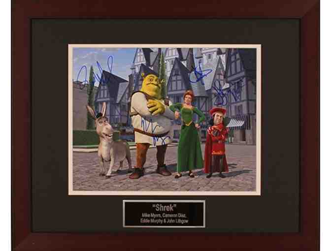 Shrek Cast 11X14 Animation Art - signed by cast, 4 Autographs include: Mike Myers (Shrek), Cameron Diaz (Princess Fiona), Eddie Murphy (Donley) and John Lithgow (Lord Farquaad).