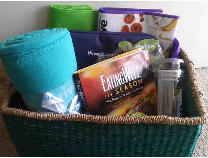 This fun gift basket with a picnic theme includes: "Eating Well in Season: The Farmers' Market Cookbook", Cute collapsible picnic cooler bag, Picnic blanket, Infuser water bottle, Apple slicer and apple-shaped cutting board, Two recyclable shopping bags, Mini healthy recipe book, Fit tips booklet
