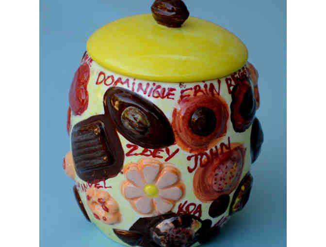 A fun ceramic cookie jar painted by our very own uber adorable 1st graders with added touches by Mrs. Adams! Perfect for your kitchen counter... Cute! Cute! Cute!