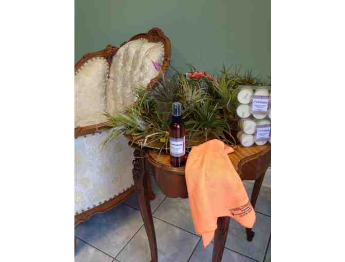 On top of the $60 gift certificate from Sweeping Dimensions, you'll also receive a gift bag with three of the most popular Atom Dei cleaning solutions, two microfiber cleaning towels, one 14 oz., 100% organic soy candle, and a decorative Tillandsia arrangement.