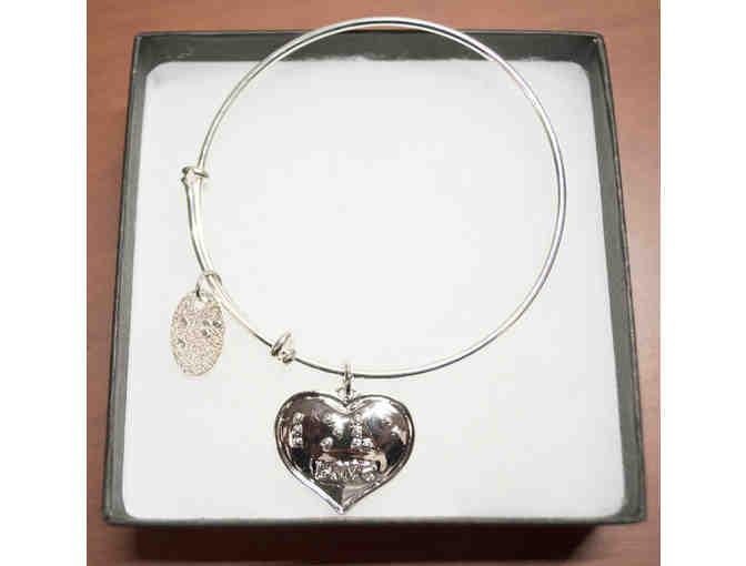 This bracelet by Kelly Fehr is shiny silver-colored metal with a one inch heart-shaped charm also in silver dangling from an adjustable bangle-type bracelet. The heart says "love" in braille and below that in print. The dangle hanging from the clasp says Kelly Fehr Jewelry in Braille.