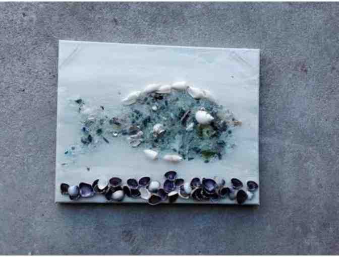 11x14 fish made of glass, resin, and seashells and resin on canvas.