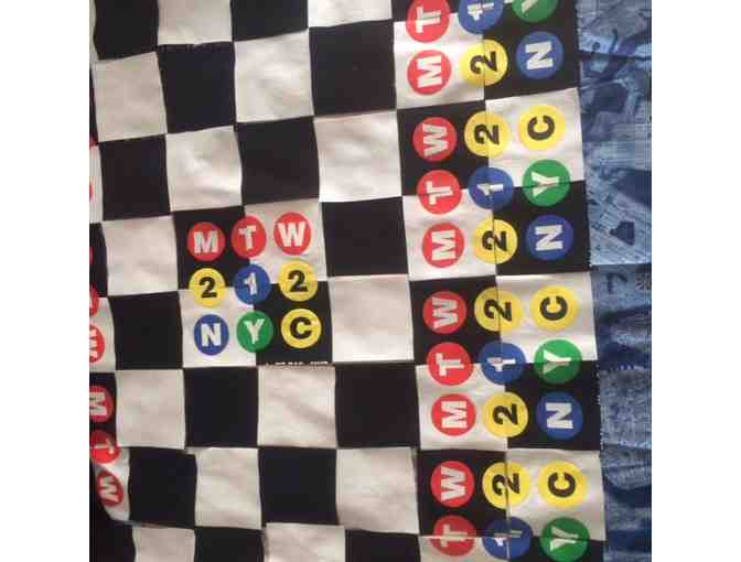 Does your family love chess or checkers? Now you can play on a one of a kind, giant black and white checker board, handmade quilt; featuring the school logo, and unique NYC fabrics, this lovely throw will be personalized for your family with a panel that can include any message you choose; includes chess and checker piece pillows.