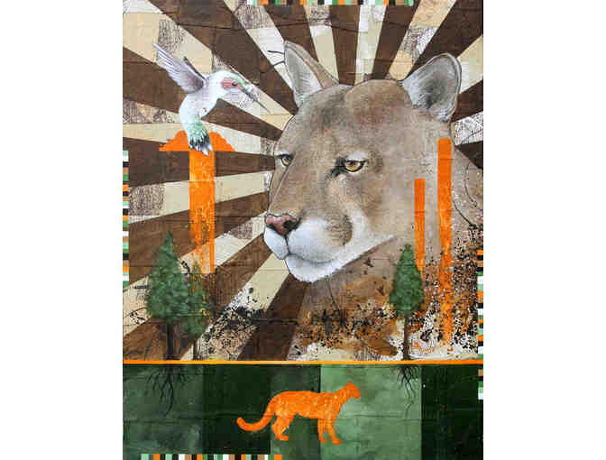 Artist Statement: Joshua Coffy is a self-taught artist living & working in San Francisco. He grew up in a variety of locales from Ohio to New Mexico to Florida & finally California. Moving from one region to another helped to shape his cultural views of the world as well as inspire him to create art in unique & varied ways. Coffy draws inspiration for his Mixed Media paintings from the natural world, scientific illustrations & his love of animals. Joshs work includes many layers of textures including Paper patterns, maps, newspaper articles, & Acrylic paint. Much of his work deals with animals & how humans relate to the birds & mammals all around us. His work is usually a light-hearted & whimsical approach to our ideals about animals. "I was hiking on the peninsula one day & found myself lovestruck with California. How lucky are we to live here? This painting is inspired by that love & it was the first painting in a series of California paintings. The Mt. Lion knows exactly who she is. She is steady, cunning, strong, & a skilled hunter. I chose to paint a Mt. Lion because at the time there had been numerous big cat sightings in the redwoods & it seemed appropriate. I could just imagine myself stumbling across one on the path. There would be a moment of stunned stares....and then maybe, in her eyes, I would turn into a giant cartoon turkey. Hehe. I think we forget about the awesome power of nature until we are alone in the woods."