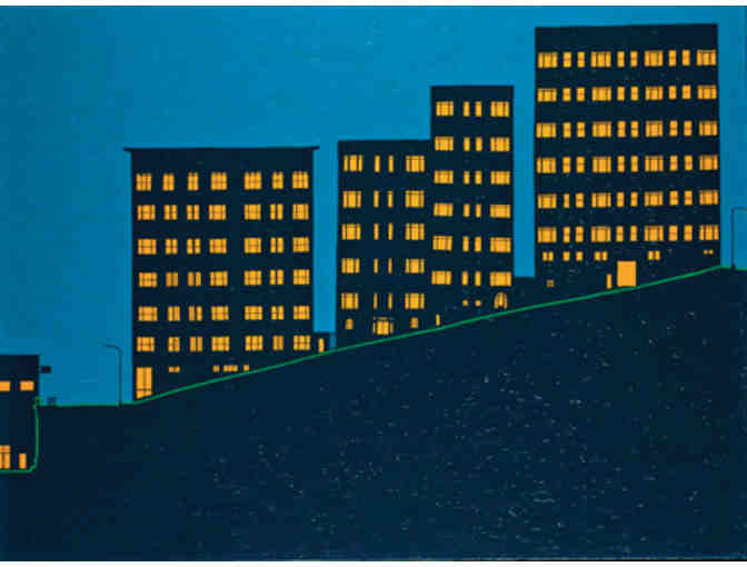 Artist Statement: This is part of a body of work I call "Places I've Done Time" in which every painting features a block of San Francisco that I have either lived on or had studio space on -- this is Stockton between Bush & Pine. If you look closely at the painting, one of my old studios looks back at you.