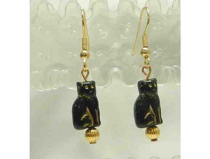Handcrafted pressed glass cat earrings with gold trim by Al McIntosh Glass Studio
