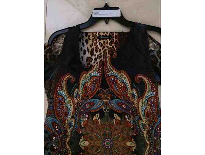 Enjoy a women's open shoulder animal print (back) floral (front) three quarter length sleeve tunic by Mesmerize. Size large.