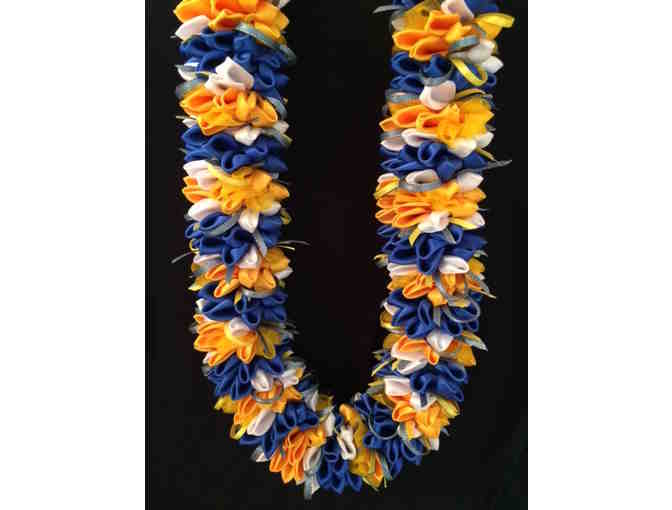 Treat yourself or someone special in your life to a beautiful 36" handmade ribbon lei, in blue, yellow and white. This unique lei is perfect for a graduation, wedding, or sporting event! The lei is made with love by the Mom of our third grade teacher, Ms. Motodani.