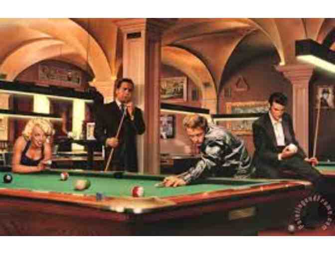 This is a reproduction of a painting by Chris Consani entitled, "Game of Fate". The piece features Marilyn Monroe, James Dean, Humphrey Bogart and Elvis playing pool and measures approx. 16 x 20 inches.