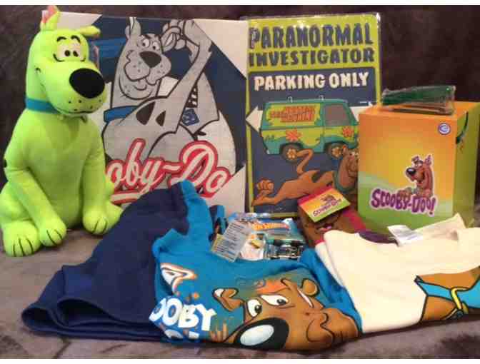 Scooby Scooby Doo, where are you? Right here! This gift pack will delight your Scooby Doo fan and includes Scooby-themed merchandise: 3-pack of socks (size 6-8 1/2), plush toy, Large T-shirt, PJs (size 4), Scooby Hot Wheels vehicle, mug, metal sign, and canvas art.