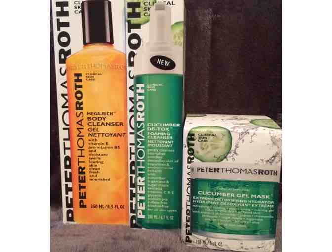 Pamper yourself with Peter Thomas Roth clinical skincare products! Peter Thomas Roth products' breakthrough formulas lead to astonishing results! E njoy a Peter Thomas Roth gift basket complete with cucumber gel mask, cucumber detox foaming cleanser, and Mega-Rich body cleanser.