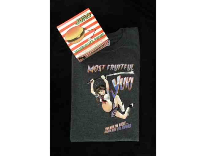 Are you or someone you know a fan of the 2007 cult hit Juno? This package includes the famous hamburger phone and 1 unisex t-shirt (size large) with Most Fruitful Yuki anime superhero printed on front. This is the perfect addition to anyone's movie memorabilia collection!