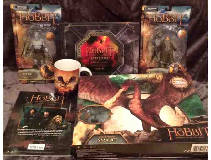You will receive two figurines from The Hobbit, The Desolation of Smaug including Radagast and Azog and a deluxe poseable Smaug which assembles to a 22" wingspan. In addition, you will receive the hardcover book "The Hobbit, The Battle of the Five Armies Chronicles Art & Design and The Battle of Five Armies Storybook. To cap off this Hobbit package, you will receive a coffee mug.