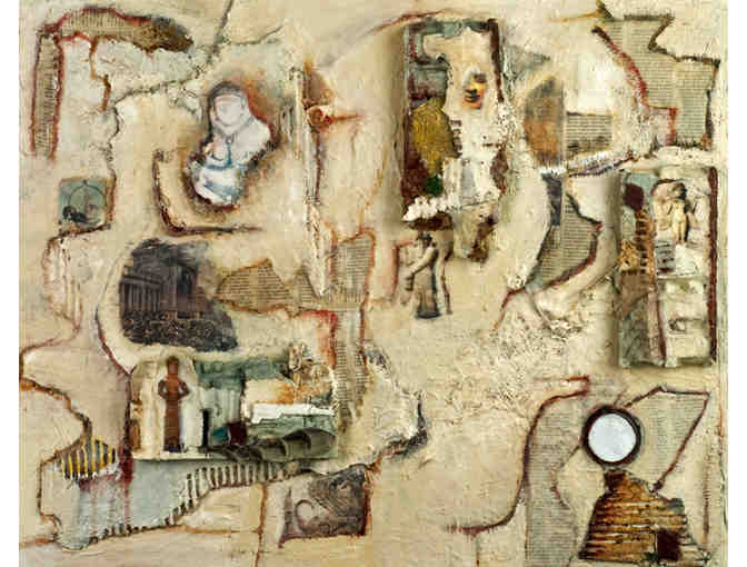 Artist Statement: Who is Ishtar? She is the Earth Mother, the Mesopotamian goddess of fertility. Ishtar's journey is perilous...but she is the eternal Mother Goddess who cannot be defeated. She overcomes each challenge she faces This mixed media meditation was inspired by a trip to the Istanbul Archeology Museum. I was awed by the ancient relicsby being able to see, in the present, something created 6000 years ago. I experienced an intense connection. At this time I also discovered a new material pulp packaging molded to protect fragile products and designed to be thrown away. Their intriguing, beautiful shapes reminded me of the relics I had seen at the museum. So I was inspired to use pulp packaging to create 3D sculptural effects, objects reminiscent of ancient temples as an element of the Ishtar art works. To these I added beach glass and newsprint, other throwaways, to further enhance the alchemy. I believe the old gods and goddesses never die. The ancient wisdom is part of our being. Even packaging materials tell a story.