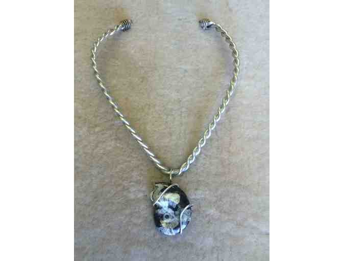 Beautiful hand-crafted aluminum necklace with Orthocerus fossil pendant and matching coil earrings.