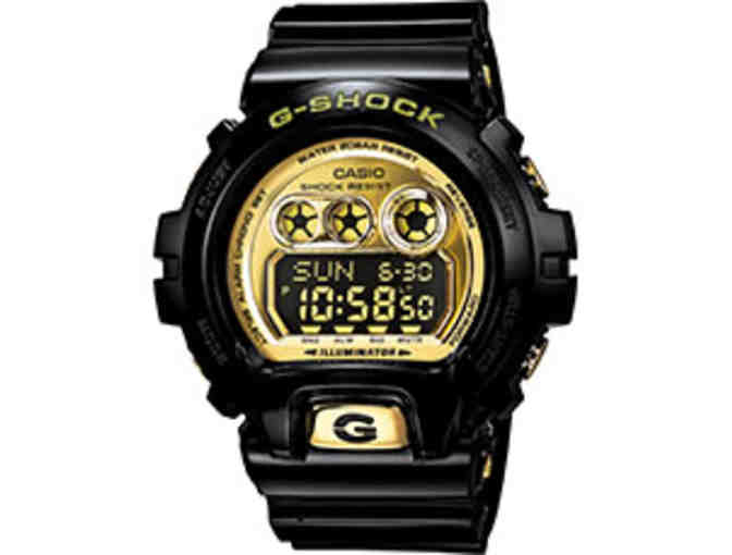 The Men's Casio G-Shock Black Watc is a perfect balance of strength and style with the new suite of oversized classic 6900 models. Continuing in the tradition of true performance innovation, G-SHOCK has turned their attention to the ever-popular 6900 model to make it almost 10% bigger; pumped full of additional features for a new generation of both G-SHOCK and basketball fans alike. Black resin band digital watch and gold mirror face.