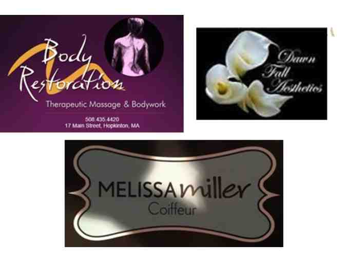 Make your skin glow with a $50 Gift Certificate to Dawn Fall Aesthetics. Take some time out and get a message with this $100 Gift Card to Body Restoration. Finally, look great without leaving the house! Melissa Miller, Personal hair concierge, will come to your house and provide a Luxe Blowout so you can look your best! Valued at $35