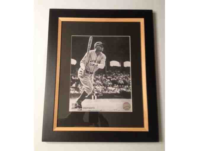 Officially Licensed 8 x10 Major League Baseball photo of Babe Ruth hitting for the New York Yankees, professionally mounted and displayed in an 11 x 14 mat and wooden wall frame.