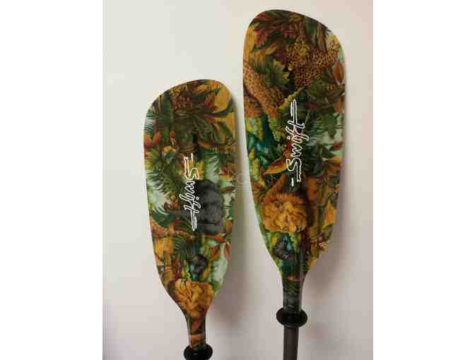 The Mid Swift is our most popular blade size and an excellent choice for most touring kayakers. The Mid Swift delivers plenty of pull and control in rough water conditions, yet it is quite well-behaved when the wind blasts against it. The only paddle many kayakers will ever need. Composite fabric blades come in stunning custom fabric inlays.