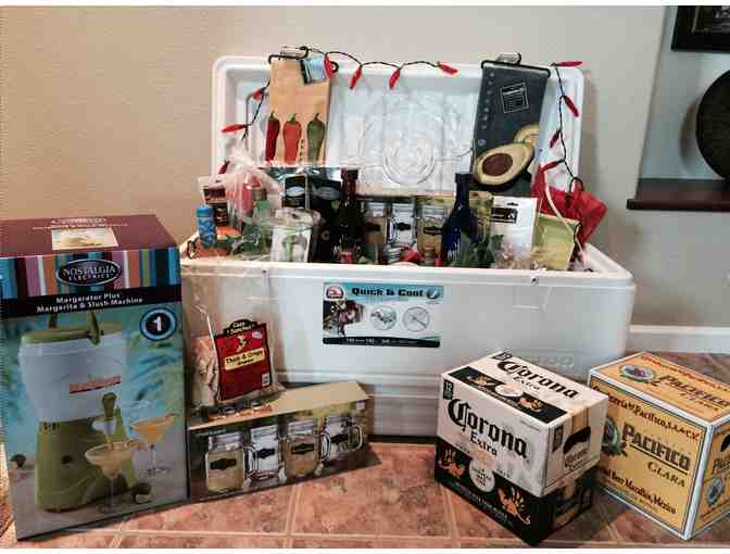 This basket has everything you need to throw a party!  Put up some new   festive decorations and invite your friends.  Included is a large white cooler packed with a 12 Pack of Coors lite & a  12 Pack  of Corona which you can serve in the 12 mason jar glasses or keep them cool in a  stainless steel drink tub.  It's a party so why stand at a blender?  Instead use the Margarita/Slushy Machine.  Then serve it up with all the necessities: a pitcherPlastic Margarita glasses, 2 bottles of Tequila, Salt for the Rim of the glasses, a lime juicer and all the fixings to make different flavors of margaritas are included.  Serve your guests with  3 different kinds of Salsa and 3 bags of  Chips in your new Chip and Dip bowls.  Use your Mi Pueblo gift card to round out the party.