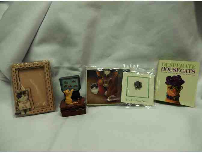 Cat collectibles: Photo magnet (3"x4"); ceramic jewelry/ring holder-Kitty watching TV (open the lid and there is a fish already inside); 3"x4" Kitty and cow 3D magnet; Desperate Housecats miniature book-the Housecats of DewClaw Lane (really cute story); and a fine handcast pewter Pawpring tie tack pin.