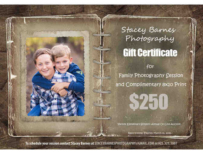 Certificate for Family Photography Session with Photographer Stacey Barnes and Complimentary 8x10 print.