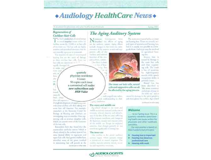 Receive 50 copies of 4 issues of the Audiology HealthCare News Physician Newsletter from Hearing HealthCare News! Mail your customized copies to all your local family, physicians, internists, pediatricians, etc..