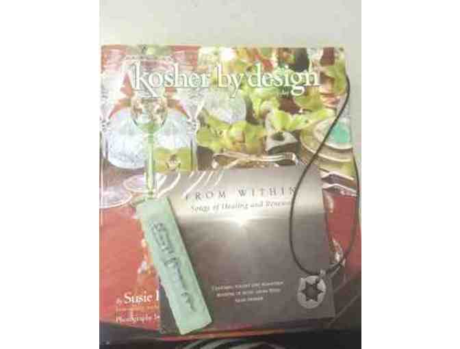 Kosher by Design cookbook by Susie Fishbein; Necklace with Magen David; Mezzuzah, and Jodi Blankstein's CD From Within: Songs of Healing and Renewal.