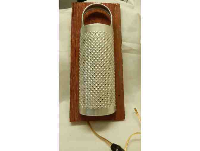Great for a night light or kitchen wall lamp, this vintage food grinder was handcrafted into a unique lamp