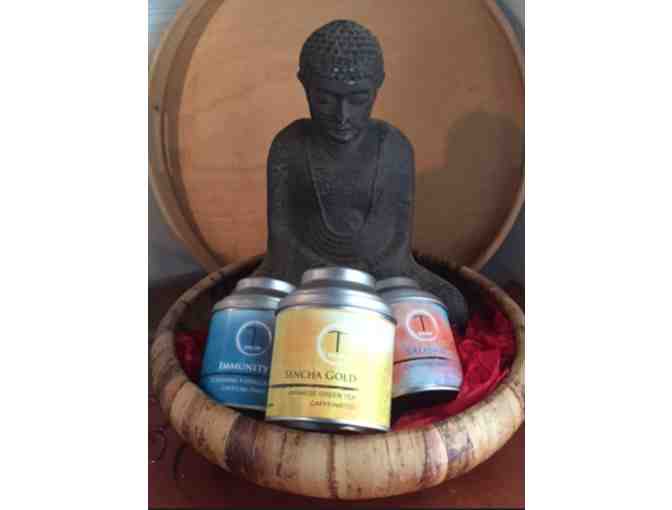 Three signature TSalon teas with a beautiful Buddha statue nestled in a gorgeous banana wood bowl.