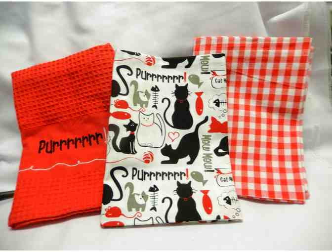 set of 3 cat kitchen hand towels. Donated by Marianne Carlson