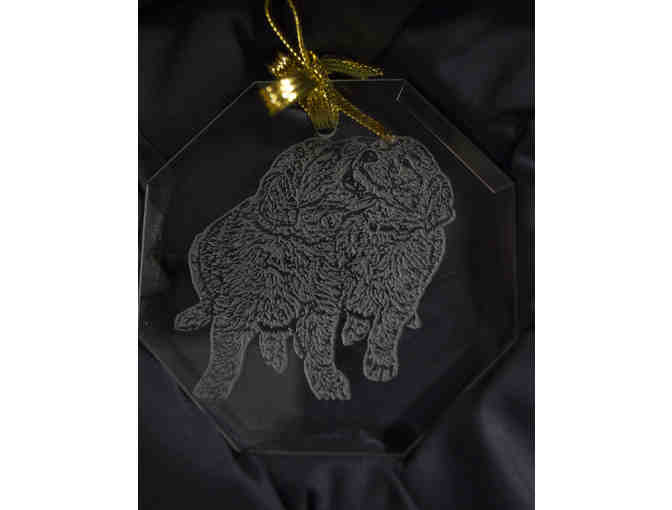 What’s cuter than two puppies playing together? These little golden retriever littermates will sparkle with mischief and fun wherever you choose to display them. Handmade on a sand carved octagonal crystal, and hung from a golden ribbon, this is a perfect ornament for any puppy lover or puppy raiser’s car, window, or holiday tree.