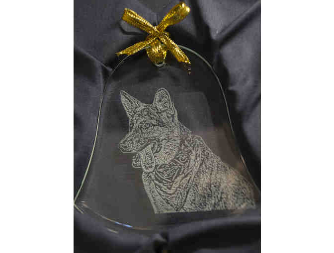 A noble German Shepherd adult with ears pricked up and tongue out, is captured on a bell-shaped sun-catcher. Wearing a scarf, this gentle dog looks alert and on point to decorate your home or holiday tree in style. The dog is etched from chest up to head on a clear glass bell-shape background.