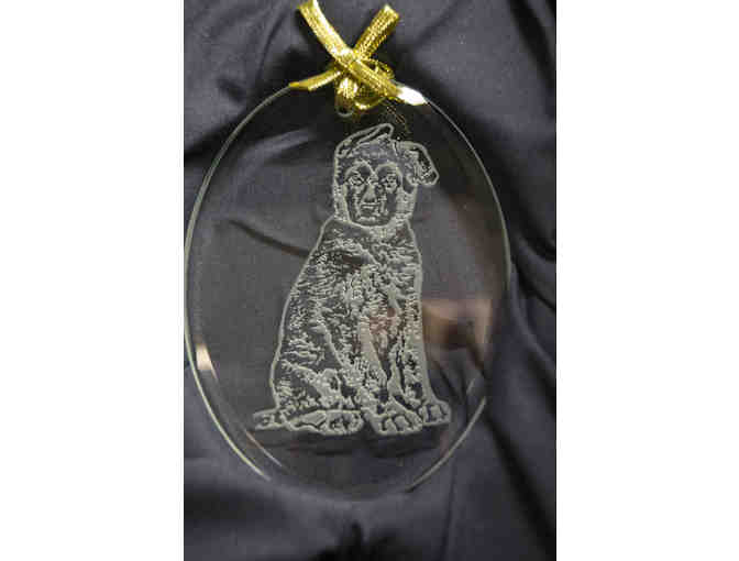 This adorable German shepherd puppy in a sitting position is etched on an oval-shaped, crystal sun-catcher. His ears flop to the side and he looks like he's ready to play. This hand-crafted reminder of your dog’s youth will be sure to bring a smile wherever you decide to display it!