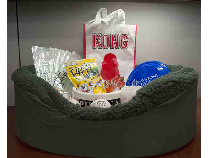 One well-loved dog is in for a soft nap. This basket contains everything Fido needs for a day of fun. There is a large white spill-proof plastic Purina feeding dish, a bag of Beggin’ Little Treats, two white tennis balls in different sizes, refrigerator magnets with cut-out for your pet’s latest pictures along with two silver frames for treasured pics. Two sizes of cups for measuring out pet food each day and two sizes of flying disks are included along with a heavy-duty Kong logo bag to carry supplies. At day’s end, he can curl up in a plush forest green canvass and fleece bed with sides. The medium size bed measures approximately 20" X 14" inside and has a removable, fully washable cover.