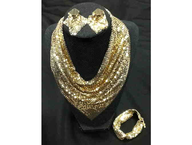 Gold Lame (custom) jewelry ensemble consisting of elegant necklace, bracelet and clip earrings. Enjoy these elegant accessories on a special dress-up night!