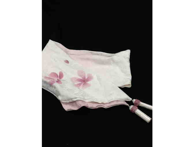 A lovely pink and white hand painted silk scarf featuring a Cherry Blossom design by artist Emi Kikuchi.