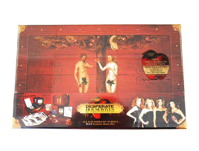 Brand-new and factory sealed, DESPERATE HOUSEWIVES Seasons 1-8 the complete series in a DVD box set. Inside this exquisitely appointed box, a treasure trove of guilty pleasures awaits. Delve inside and bite into the forbidden fruit that has seduced and satisfied audiences for almost a decade: ABC’s DESPERATE HOUSEWIVES: THE COMPLETE COLLECTION. This special collector’s set is a must-own indulgence for true fans of the iconic series and includes all eight juicy seasons on 45 discs. Plus an additional disc full of exclusive bonus features is included. Revisit the ladies of Wisteria Lane and relive every delicious, decadent moment with the collection that’s completely “Desperate” and utterly Divine!